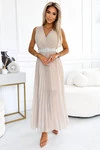 467-2 LOUISE długa suknia z dekoltem i rozcięciem na nogę - BEŻOWA z brokatem