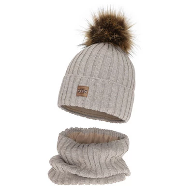 Czapka i komin dla dziewczynki zimowy komplet, beżowy, podszyty polarem, z wełną merino Bellina