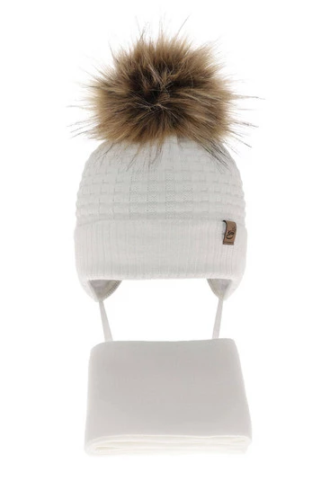 Czapka i komin dla dziewczynki zimowy komplet, biały, z dwoma pomponami Minsi