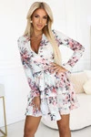 CAROLINE Zwiewna sukienka z kopertowym dekoltem i falbanami - kolorowe kwiaty