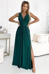490-3 SUSAN Długa brokatowa suknia z dekoltem i przeszyciami w pasie - ZIELEŃ BUTELKOWA