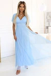 581-3 JENNIFER długa suknia z rozcięciem na nogę, rękawkiem i dekoltem - BŁĘKITNA