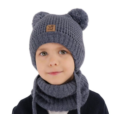 Czapka i komin dla chłopca zimowy komplet, niebieski, z dwoma pomponami, wiązany Krispi