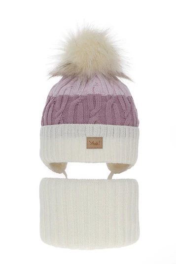 Czapka i komin dla dziewczynki zimowy komplet, fioletowy, z pomponem, wiązany Dilajla