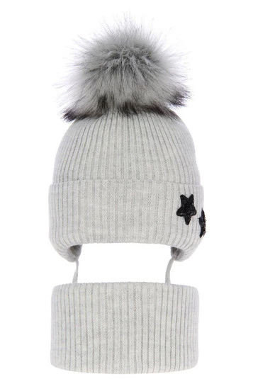 Czapka i komin dla dziewczynki zimowy komplet, jasnoszary, z pomponem, wełniany merino Aprilia