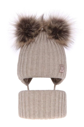 Czapka i komin dla dziewczynki zimowy komplet, beżowy, z dwoma pomponami, wiązany Telisa