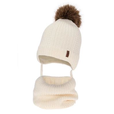 Czapka i komin dla dziewczynki zimowy komplet, beżowy, z wełną merino, z pomponem, wiązany Muanda