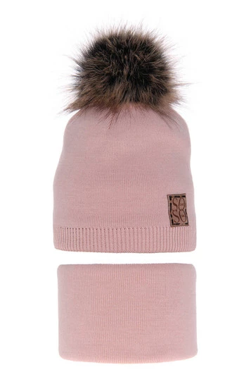 Czapka i komin dla dziewczynki zimowy komplet, beżowy, z dwoma pomponami, wiązany Telisa