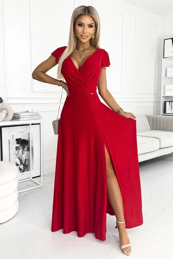 Błyszcząca długa sukienka z dekoltem i rozcięciem na nodze - ZIELEŃ BUTELKOWA z brokatem