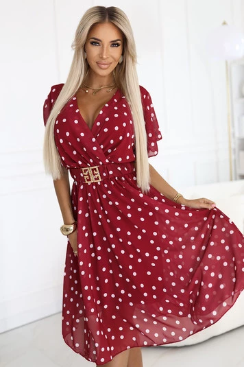 Zmysłowa sukienka w białe groszki z kopertowym dekoltem i ozdobnym paskiem - bordowa