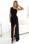 SELENA zjawiskowa długa sukienka na jedno ramię z brokatowym połyskiem i rozcięciem na nodze - CZARNA