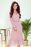 PATRICIA - sukienka z dłuższym tyłem i koronkowym dekoltem - PUDROWY RÓŻ