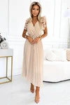 MIRABELLA Plisowana szyfonowa sukienka midi z dekoltem i finezyjnymi falbankami - BEŻOWA
