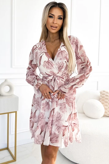 Plisowana szyfonowa długa sukienka z dekoltem, długim rękawkiem i paskiem - NIEBIESKA w kwiaty