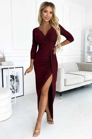 Błyszcząca długa sukienka z dekoltem i rozcięciem na nodze - BORDOWA z brokatem