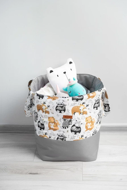 Kosz na zabawki Medium jest bardzo pojemny i niezwykle trwały. Dzięki kwadratowej podstawie pomieści więcej niż standardowe kosze. Jego uchwyty do przenoszenia są wewnątrz wzmocnione taśmą parcianą, dlatego nie straszne mu są duże ilości zabawek. Dolna część kosza oraz jego wnętrze zostało wykonane z trwałego materiału poliestrowego, mało podatnego na przetarcia i rozdarcia, natomiast górna część ozdobiona jest kolorową bawełną, która nadaje niepowtarzalny urok i sprawia, że kosz stanowi ozdobę dziecięcego pokoiku. Świetnie sprawdzi się również jako kosz na pranie lub organizer na inne przedmioty. Usztywniony został warstwą włókniny silikonowej, dzięki czemu zachowuje swój kształt, a w razie potrzeby można go złożyć i schować do szuflady. Uszyty w Polsce z wysokiej jakości materiałów.