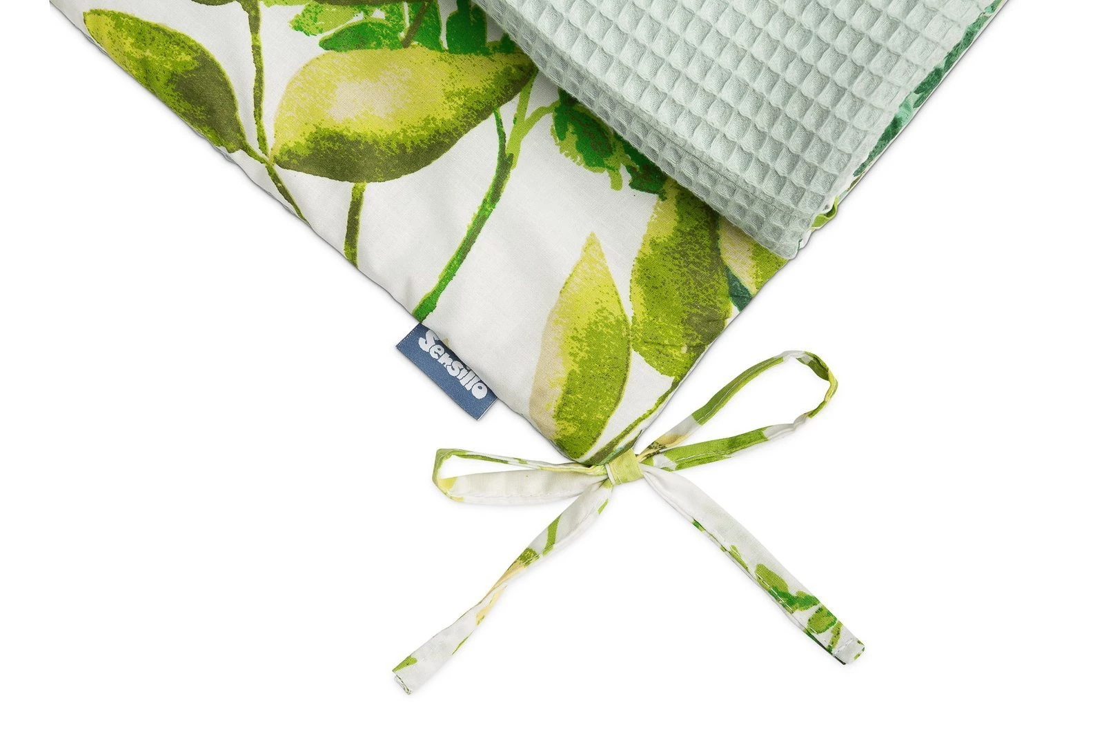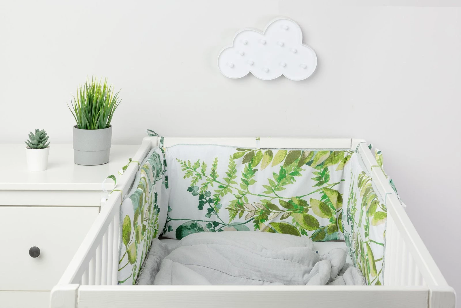 Cienki ochraniacz do łóżeczka od Sensillo to alternatywa dla grubych i ciężkich ochraniaczy powszechnie stosowanych w dziecięcych łóżeczkach. Cienkie wypełnienie z antyalergicznej owaty zapewnia odpowiednią izolację, ochroni dziecko przed urazami podczas poruszania się po łóżeczku, a przede wszystkim jest bezpieczne i minimalizuje ryzyko uduszenia się maluszka. Na niepowtarzalny wygląd ochraniacza składa się połączenie dwóch materiałów. Jedna strona wykonana została z miękkiej i przyjemnej w dotyku bawełny o strukturze wafla oraz druga z bawełny z kolorowym nadrukiem. Obie tkaniny posiadają certyfikat Oeko-Tex. Wszyte co ok. 30 cm tasiemki do mocowania gwarantują utrzymanie ochraniacza we właściwej pozycji.