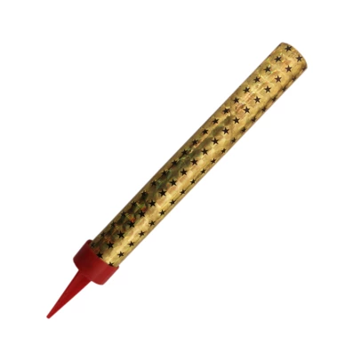 Fontanna dzięki plastikowej końcówce utrzymuję się w pionie. W celu odpalenia fontannę należy umieścić pionowo. Po odpaleniu z fontanny tortowej sypią się w górę złoto-srebrne iskierki.