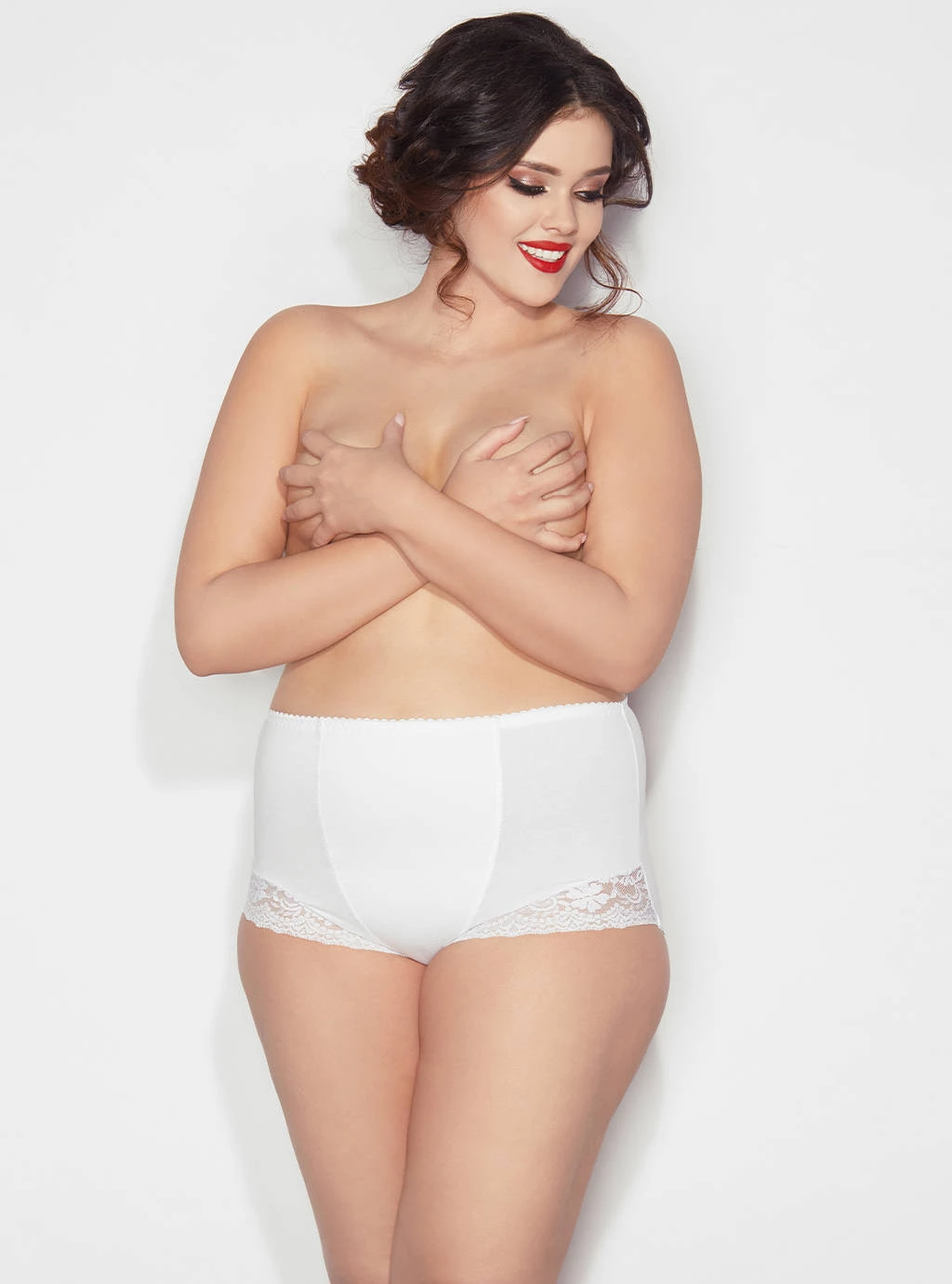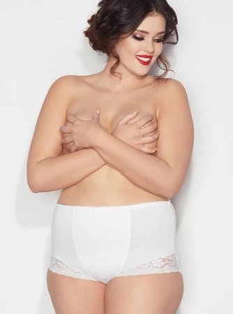 Bestseller figi Ela. Bawełniane wyższe figi modelujące. Dzięki podwójnej warstwie dzianiny wszytej z przodu delikatnie spłaszczają i modelują brzuch. Nogawki w przedniej części wykończone są miękką koronką.