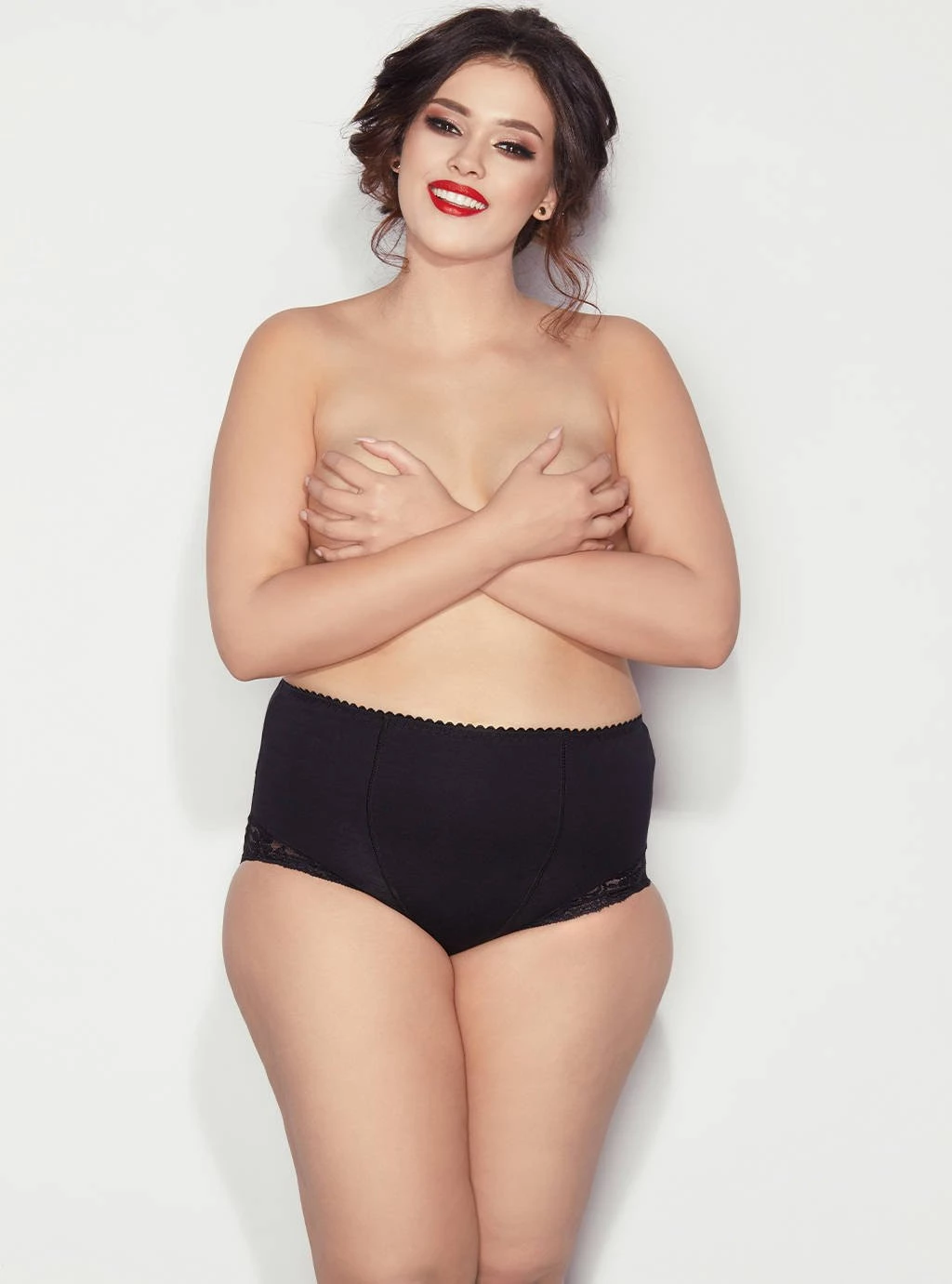 Bestseller figi wyszczuplające czarne Ela. Bawełniane wyższe figi modelujące. Dzięki podwójnej warstwie dzianiny wszytej z przodu delikatnie spłaszczają i modelują brzuch. Nogawki w przedniej części wykończone są miękką koronką.