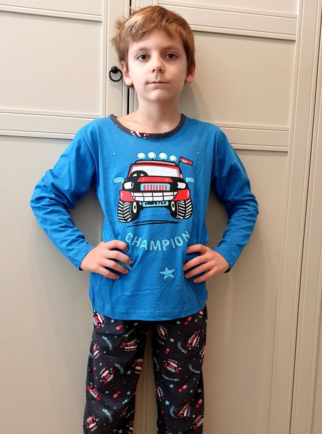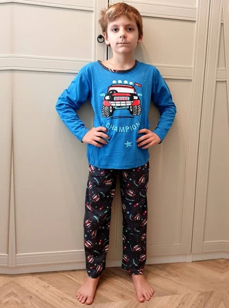 Piżama wykonana z 100% bawełny , góra z długim rękawkiem i ozdobiona printem, spodnie - długie wzorzyste długość do kostki są na elastycznej gumce, dekolt okrągły wykończony lamówką w kolorze spodni. Piżama jest bardzo wygodna i miła w dotyku.