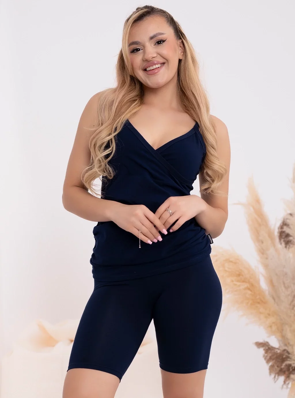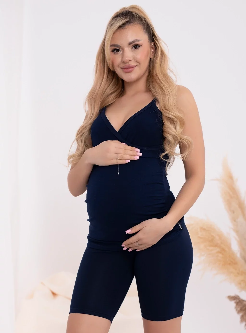 Komfortowe granatowe szorty ciążowe z niskim panelem ciążowym pod brzuch, zostały uszyte w Polsce. Elastyczne legginsy ciążowe krótkie to doskonałe rozwiązanie na ciepłe letnie dni zarówno do tuniki jaki eleganckiej bluzki. Modne krótkie getry w kolorze granatu, to fajny pomysł który będzie z pewnością pasował również do garderoby przyszłej mamy kiedy brzuszek ciążowy wraca do swojej kondycji przed ciąży. Specjalnie zaprojektowane modele legginsów ciążowych z pasem pod brzuch to strzał w 10! jeżeli lubisz komfort i wygodę od I trymestru ciąży.