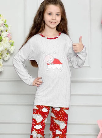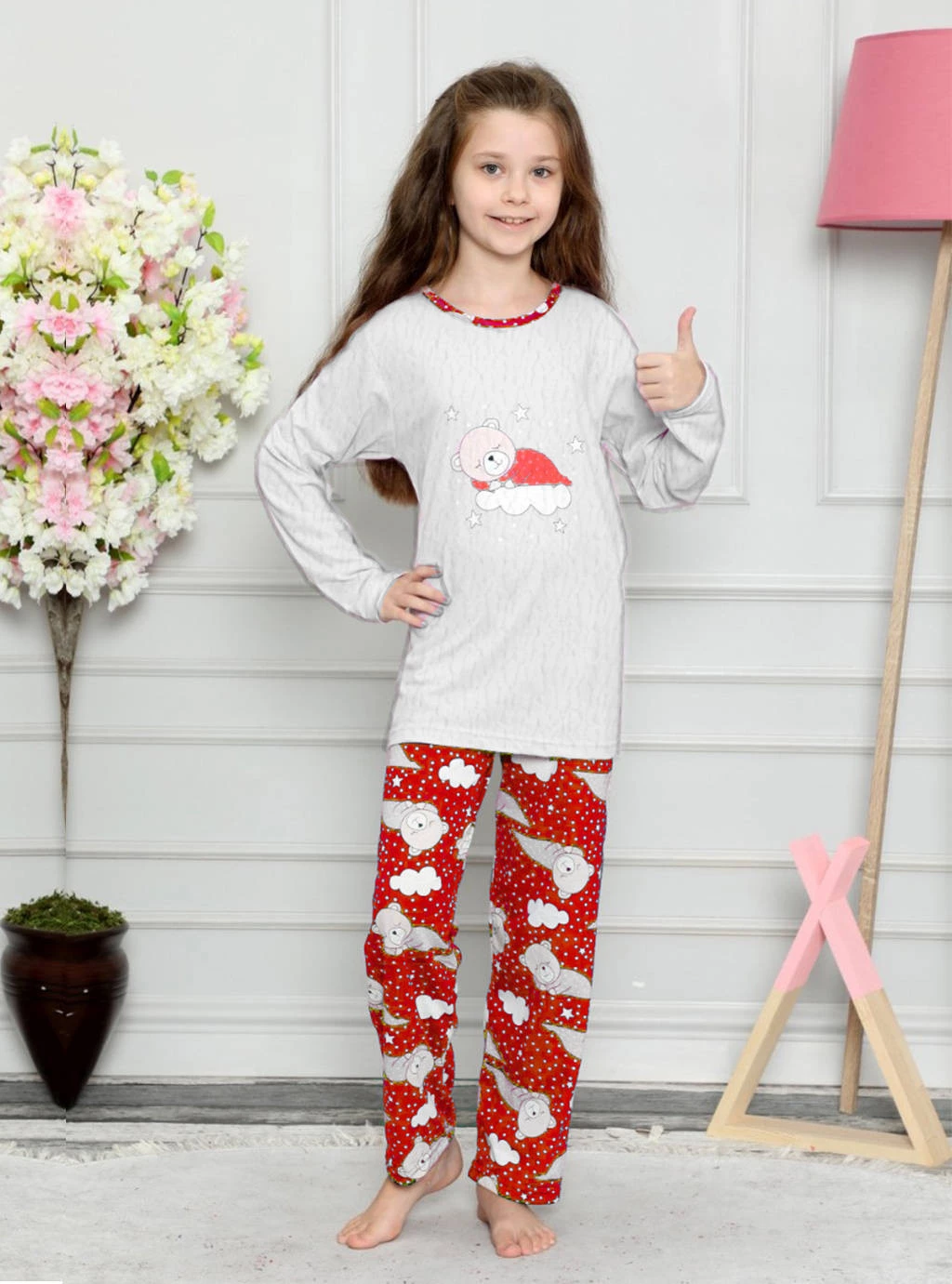 Piżama wykonana z 100% bawełny , góra z długim rękawem, ozdobiona printem śpiącego misia, spodnie - długie, wzorzyste, na elastycznej gumce, dekolt okrągły wykończony lamówką. Piżama jest bardzo wygodna i miła w dotyku.