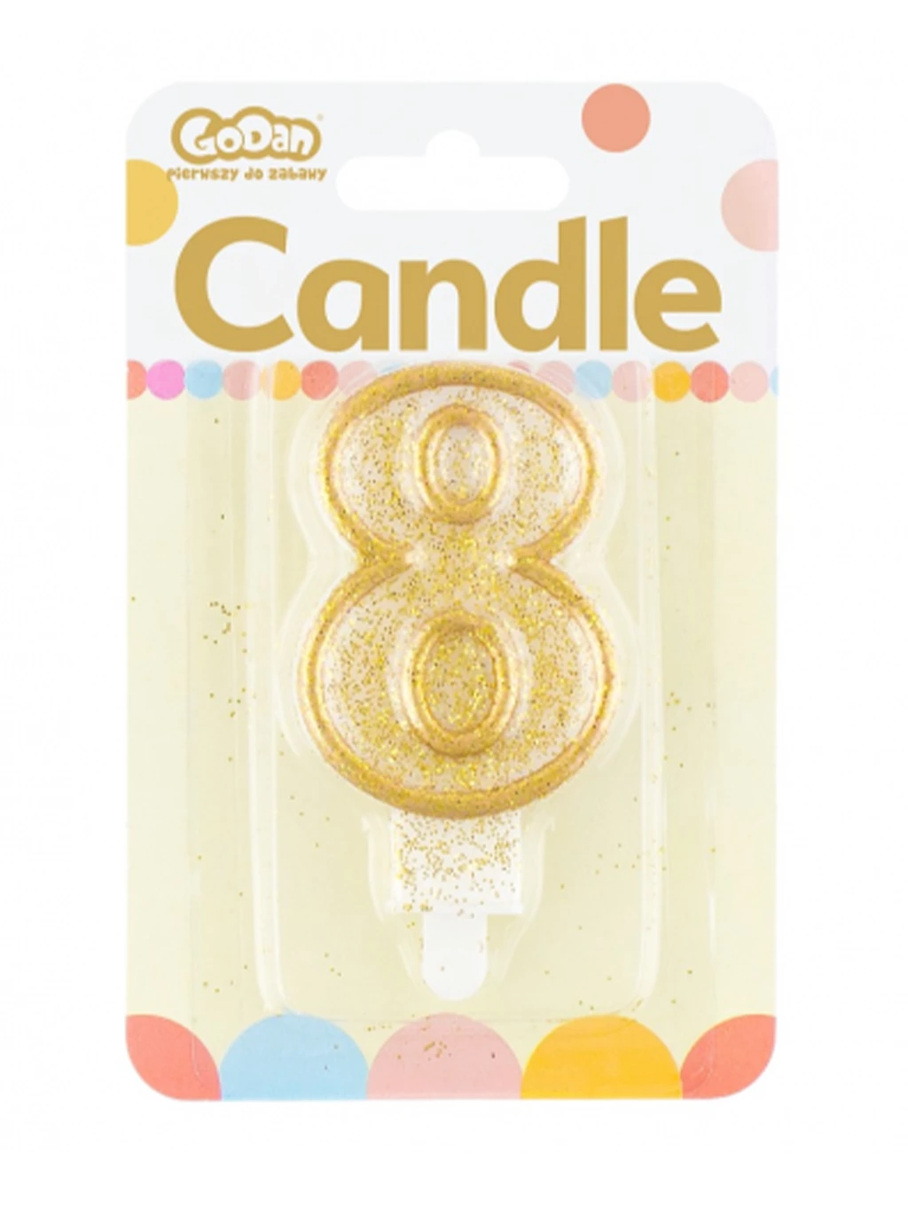 Świeczka urodzinowa cyferka "8" w kolorze Gold glitter- złoty brokatowy kontur.