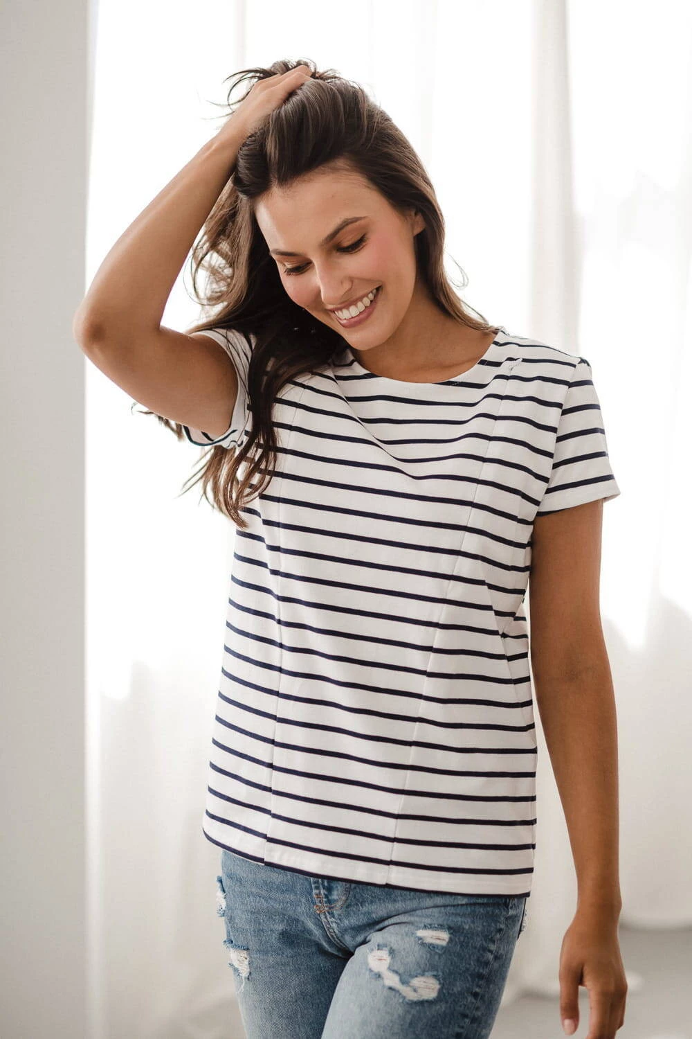 Biała bluzka w czarne paski to idealna bluzka dla karmiących w stylu basic. Bluzka dla świeżo upieczonych mam to kwintesencja stylu i kobiecości w garderobie. Bluzki damskie z wygodnymi zamkami do karmienia pozwolą Ci dyskretnie i bez problemu nakarmić maleństwo nawet w miejscach publicznych jak galeria czy park. Jak każda damska bluzka w typie basic i ta kobieca bluzka dla przyszłych mam to idealna baza dla Twoich codziennych stylizacji.