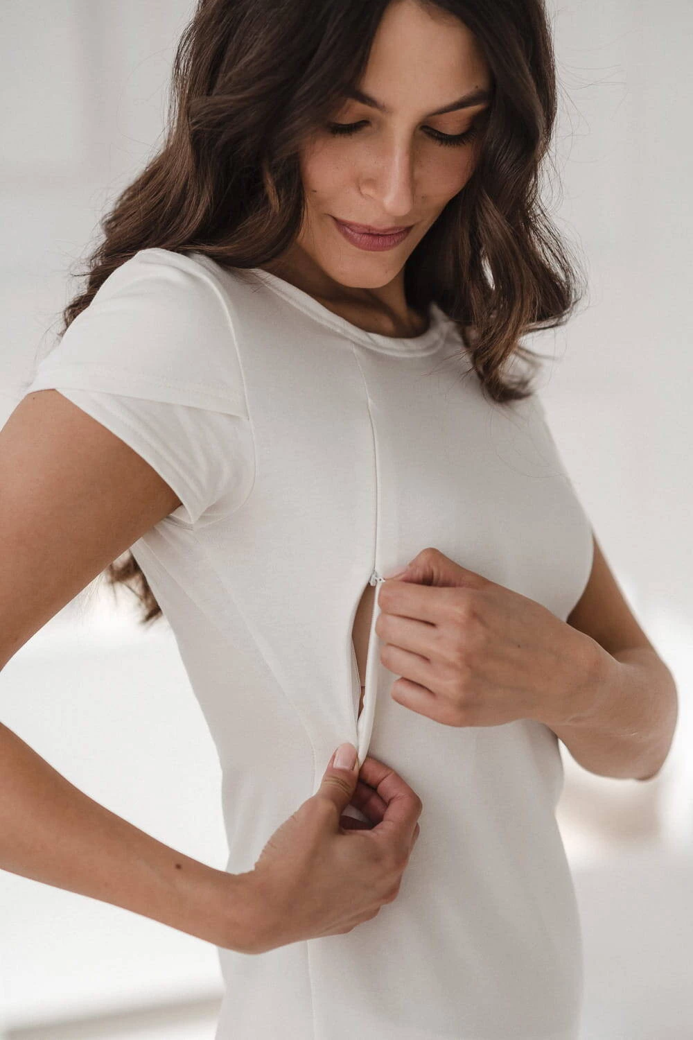 Sukienka do karmienia piersią z krótkim rękawem Milky Dress - w kolorze śmietankowej bieli to wyjątkowy element z naszej kolekcji na okres karmienia piersią i początkowy etap ciąży. Kreacje takie jak sukienki dla karmiących mam zostały zaprojektowane z myślą o kobietach, aby zaspokoić ich wysokie wymagania. Ta modna białą sukienka dla mam nie tylko prezentuje się stylowo, ale także umożliwia wygodne i dyskretne karmienie piersią dzięki ukrytym zamkom, łatwo dostępnym od dołu. Krój sukienki doceni każda świeżo upieczona mama, ponieważ ten ołówkowy model doskonale podkreśla sylwetkę, sprawiając, że poczujesz się atrakcyjnie i wygodnie zarówno na co dzień, jak i podczas eleganckich wyjść. Ta sukienka do karmienia piersią została uszyta w Polsce z najwyższej jakości oddychających tkanin. Wyjątkowa kobieca kreacja zachowuje swoje kształty i intensywny kolor nawet po wielu praniach.