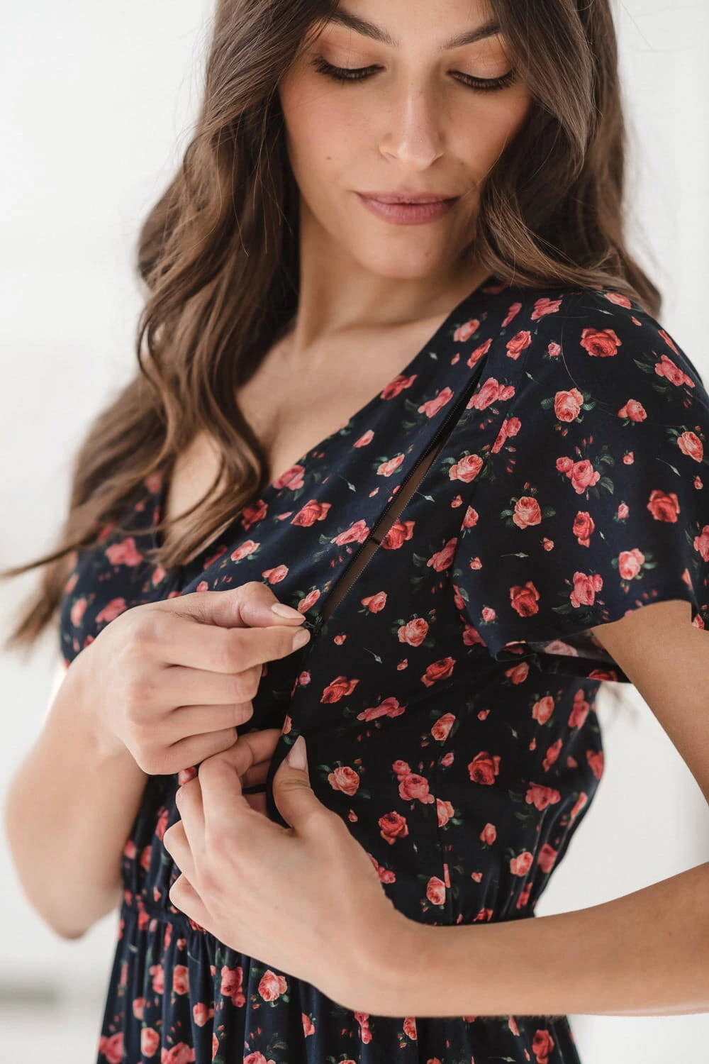 Sukienka ciążowa i do karmienia Lovely Dress krótki rękaw - Navy w różyczki
