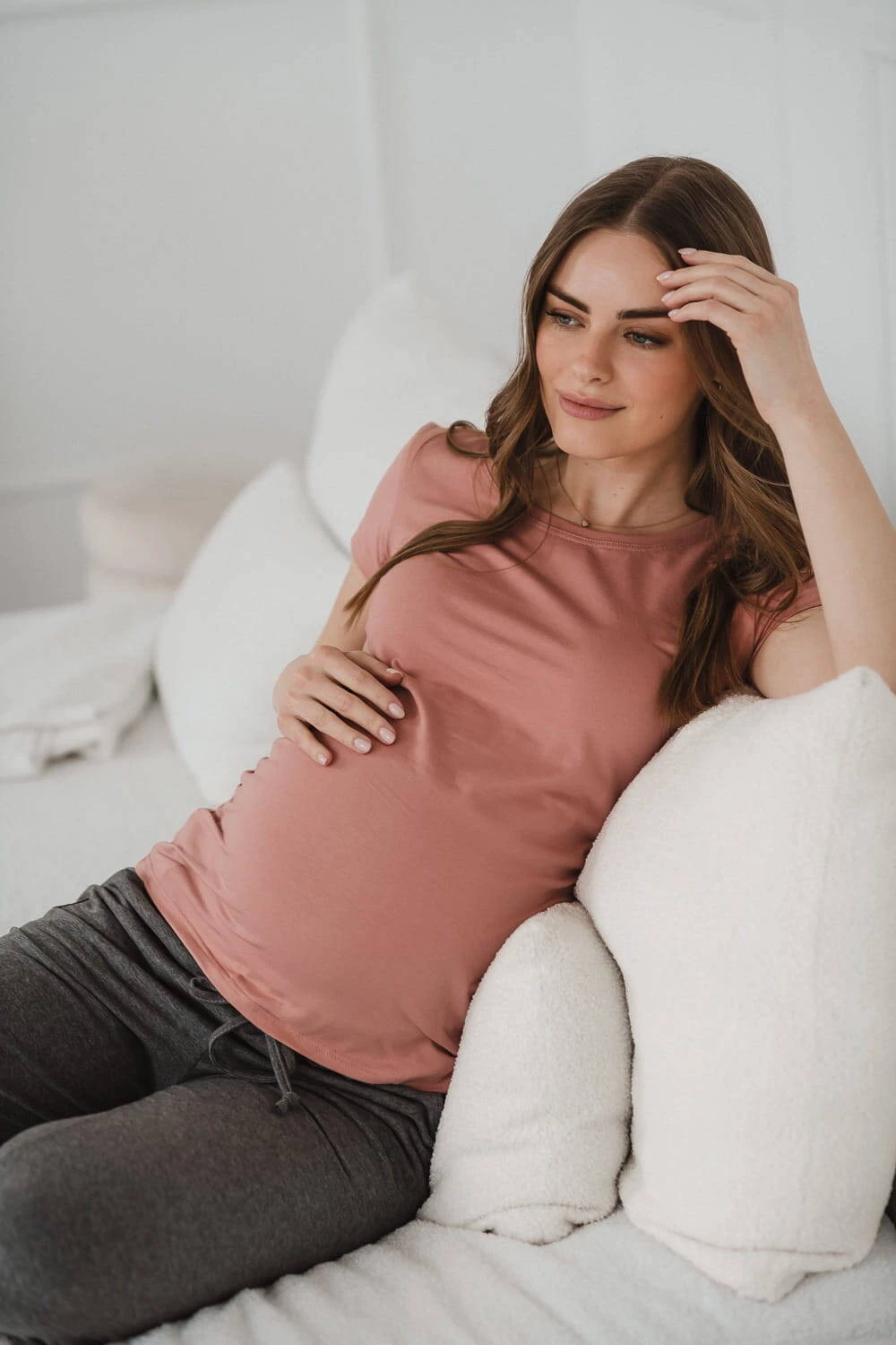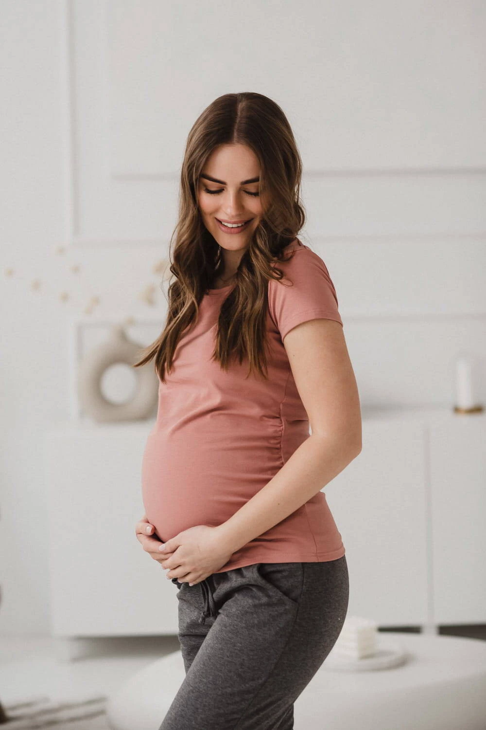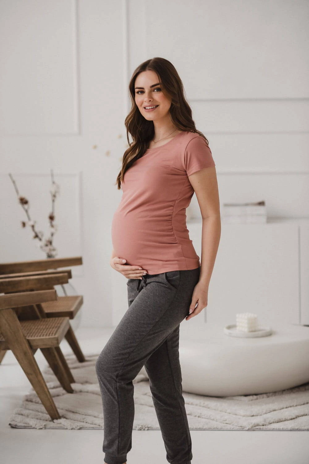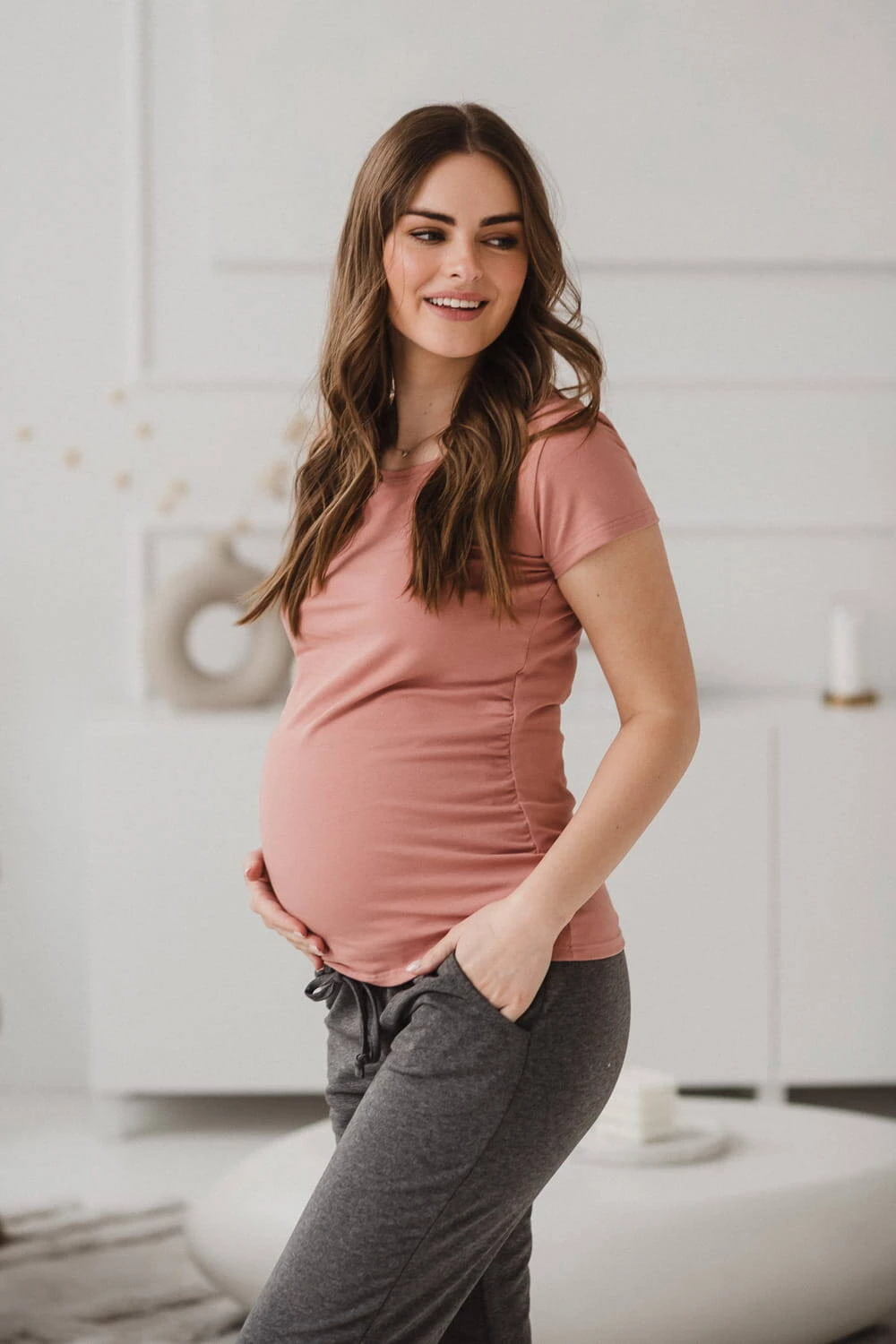 Nasza różowa idealna bluzka ciążowa z kolekcji Belly w stylu basic to kluczowy element każdej garderoby ciążowej. Bluzki damskie ciążowe z marszczeniem po bokach na wysokości pasa ślicznie podkreślają brzuszek przyszłej mamy, a elastyczny materiał oraz odpowiednia długość, zapewniają komfortowe zakrycie brzuszka i pleców w okresie ciąży. Jak każda damska bluzka w typie basic i ta kobieca bluzka ciążowa to idealna baza dla Twoich ciążowych stylizacji.