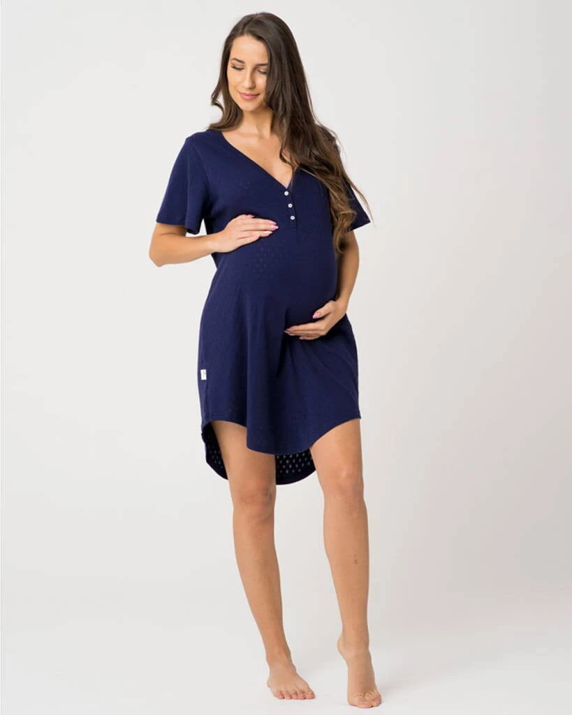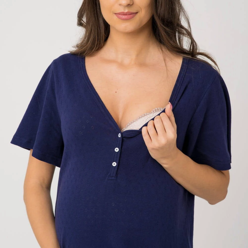 Przedstawiamy Państwu ładną i funkcjonalną koszulę nocną do porodu i do karmienia Goodnight Kiss w klasycznym kolorze granatowym. Ta niezwykle delikatna i miękka ażurowa koszula dla kobiet w ciąży i do karmienia, została stworzona z myślą o tych Paniach, którzy oczekują najwyższego komfortu. Koszula do karmienia została wykonana ze 100% z bawełny, która jest naturalną tkaniną zapewniającą doskonałe warunki do snu. Jej luźny krój i rozciągliwe właściwości tkaniny z łatwością dopasują się do rosnącego brzuszka, zapewniając wygodę na każdym etapie ciąży. Dodatkowo, dekolt zapinany na guziczki ułatwia nocne karmienie maluszka, sprawiając, że ta uniwersalna komfortowa koszula może Ci towarzyszyć od pierwszych chwil ciąży aż po narodziny dziecka.