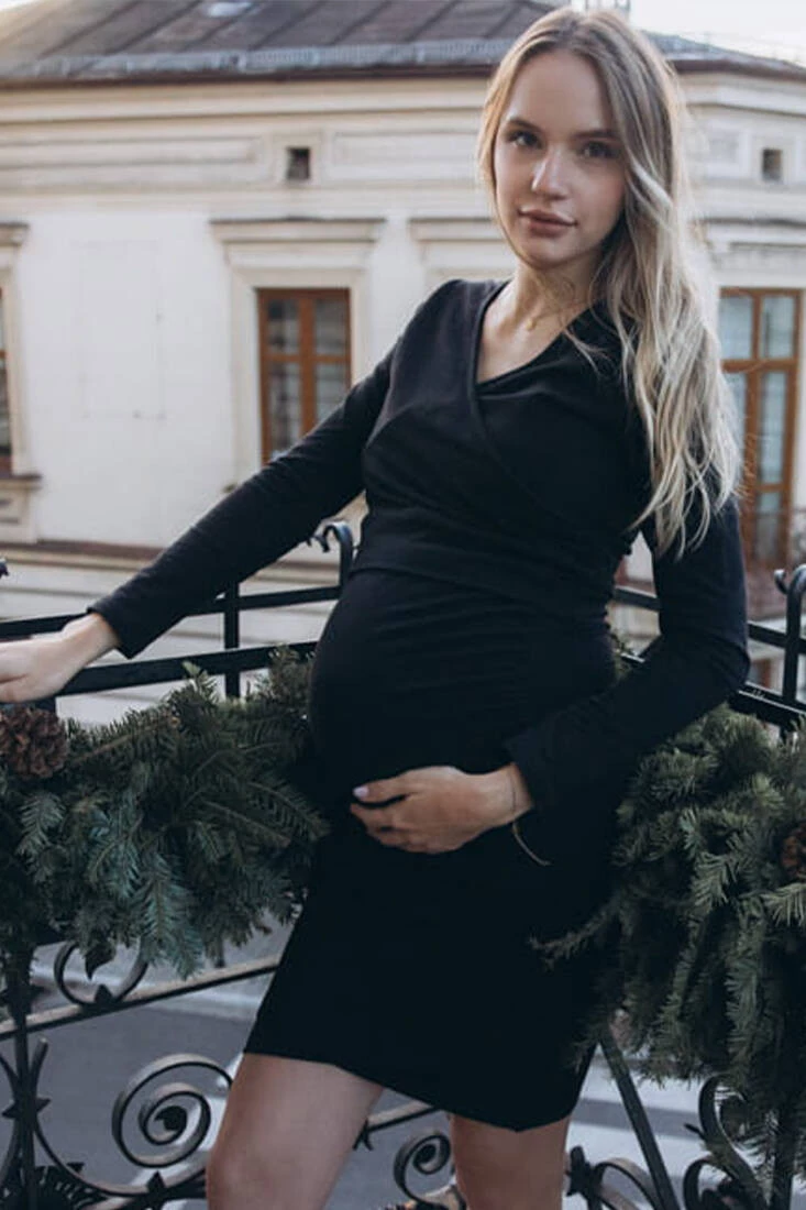 Klasyczna czarna spódniczka ciążowa i wygodna kopertowa bluzka "Latte Mama" to zestaw ciążowy i do karmienia który został zaprojektowany z myślą o komforcie i wygodzie przyszłych mam. Odzież ciążowa wykonana z bardzo elastycznej bawełnianej tkaniny,typu cienki dres idealnie dopasowuje się do rosnącego brzuszka, zapewniając komfort przez cały okres ciąży, a później dzięki komfortowemu krojowi bluzka ułatwia proste i dyskretne karmienie piersią. Elastyczny materiał sprawia, że zarówno spódnica damska ciążowa jak i wygodna bluzka nie krępują ruchów i jest niezwykle doskonałe do noszenia na co dzień.
