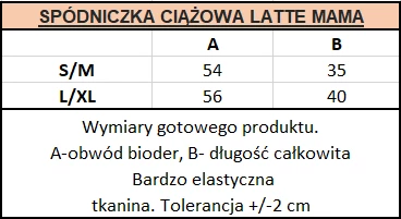 Polecamy wybrać swój rozmiar sprzed ciąży, spódniczka uszyta została z elastycznego materiału przez co zakłada dużą tolerancję wyborze rozmiaru.