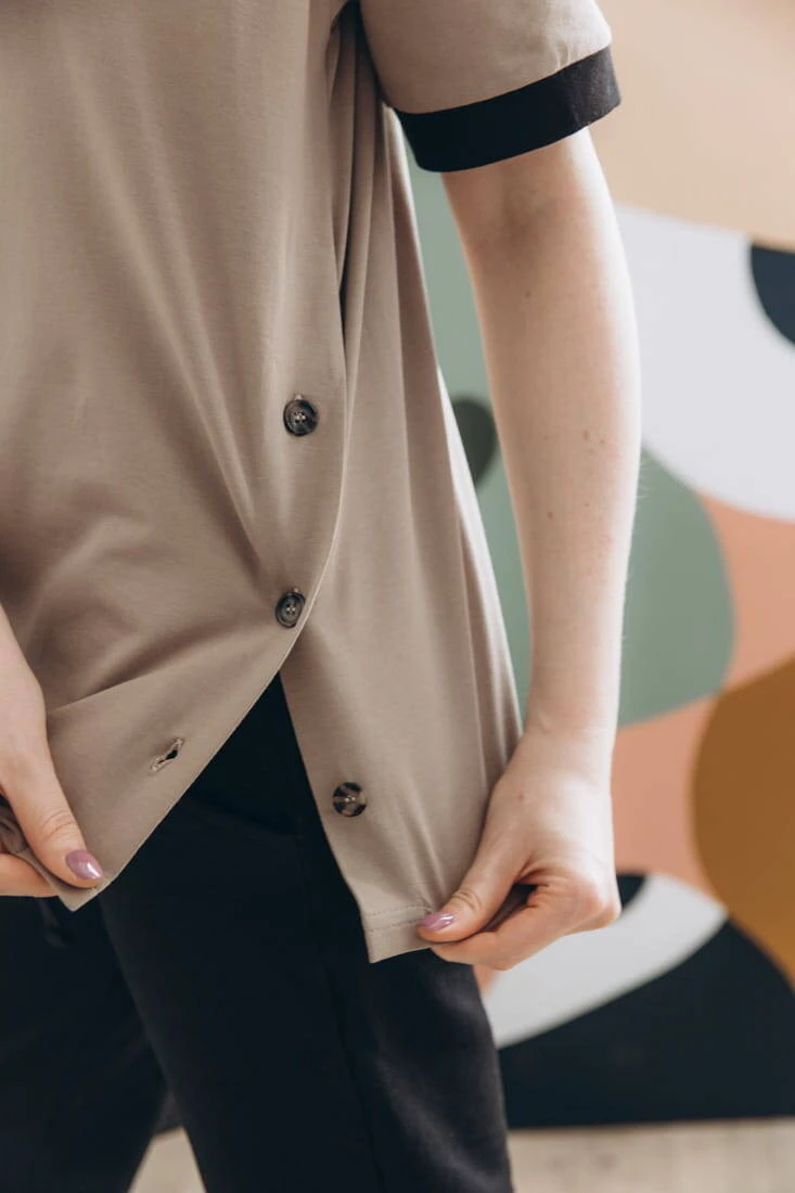 Praktyczne guziki umieszczone po bokach koszulki umożliwiają łatwy i dyskretny dostęp do piersi podczas karmienia dziecka, co czyni ten t-shirt niezwykle funkcjonalnym.