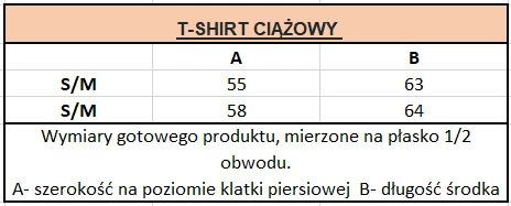 Jak dopasować rozmiar? Polecamy wybrać swój rozmiar sprzed ciąży, fason jest oversizowy. Nie ma potrzeby brania "rozmiaru na zapas". Rozmiarówka jest standardowa - uwzględniająca brzuszek, szczegółowe wymiary poniżej. Modelka na zdjęciu nosi rozmiar S/M, ma 173 cm wzrostu, obwód brzuszka w najszerszym miejscu 105 cm