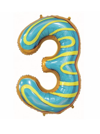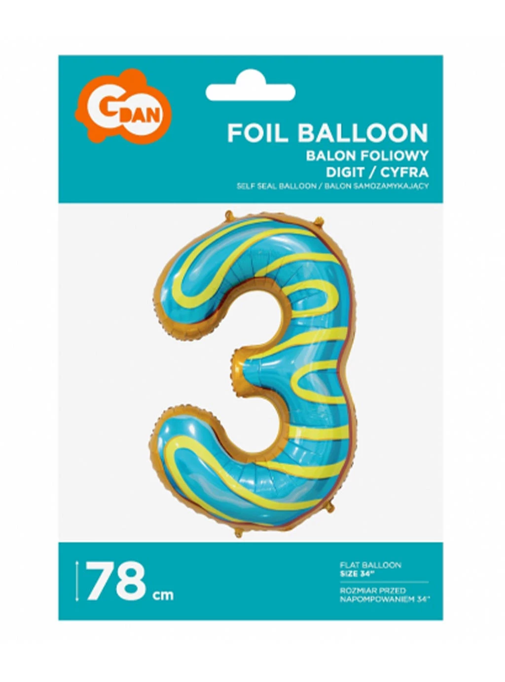 Balon foliowy w kształcie cyfry 3 z nadrukiem ciasteczka z lukrem to przesłodka dekoracja na 3. urodziny Twojego Maleństwa, drugą rocznicę ślubu i wiele innych okazji.