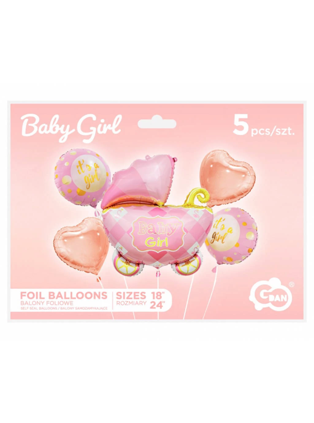 Poznaj zestaw balonów na baby shower dziewczynki zaprojektowany przez naszych doświadczonych dekoratorów, który zaczaruje przestrzeń i oczaruje gości. Sercem dekoracji jest duży balon foliowy w kształcie błękitnego wózka z napisem „Baby Girl”. Balon pięknie mieni się w świetle, tworząc niesamowity efekt, a po napełnieniu osiąga imponujących rozmiarów kształt.