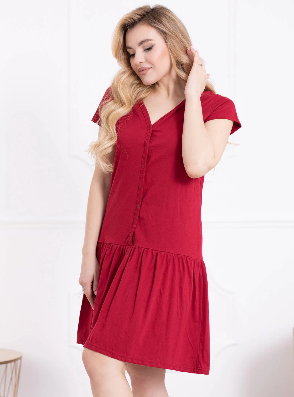 Śliczna koszula z falbanką w kolorze bordo to rozwiązanie które młoda mama na pewno powinna rozważyć wybierając koszulę nocną. Koszula do karmienia rozpinana przez środek przyda Ci się również do szpitala i do porodu.