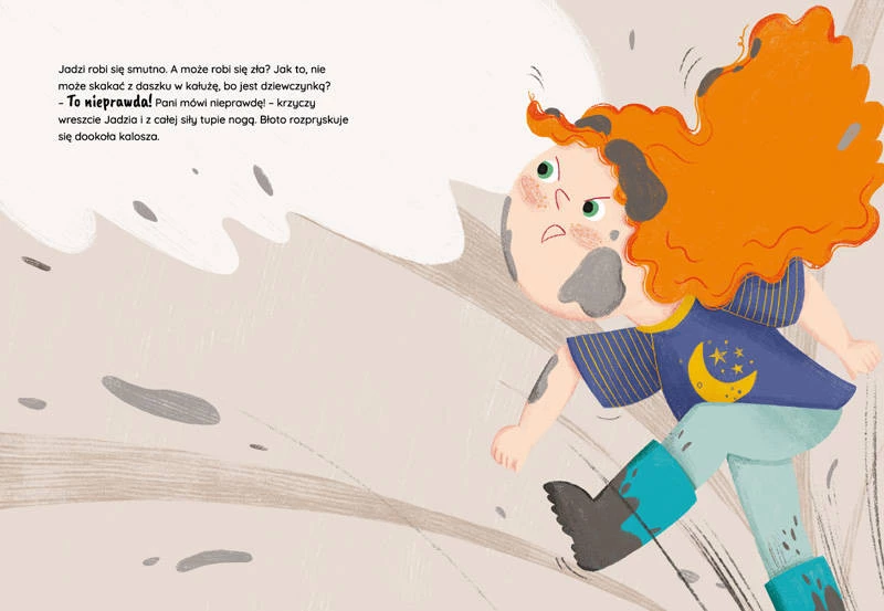 – No, no no! Po prostu pięknie! Co to za wygłupy! Co to za wymysły! – Podbiega pani Stasia. – Żeby to tylko chłopiec, ale i dziewczynka. Przecież dziewczynkom nie wypada się tak bawić. Jesteś cała brudna, obłocona! Co powie mamusia?