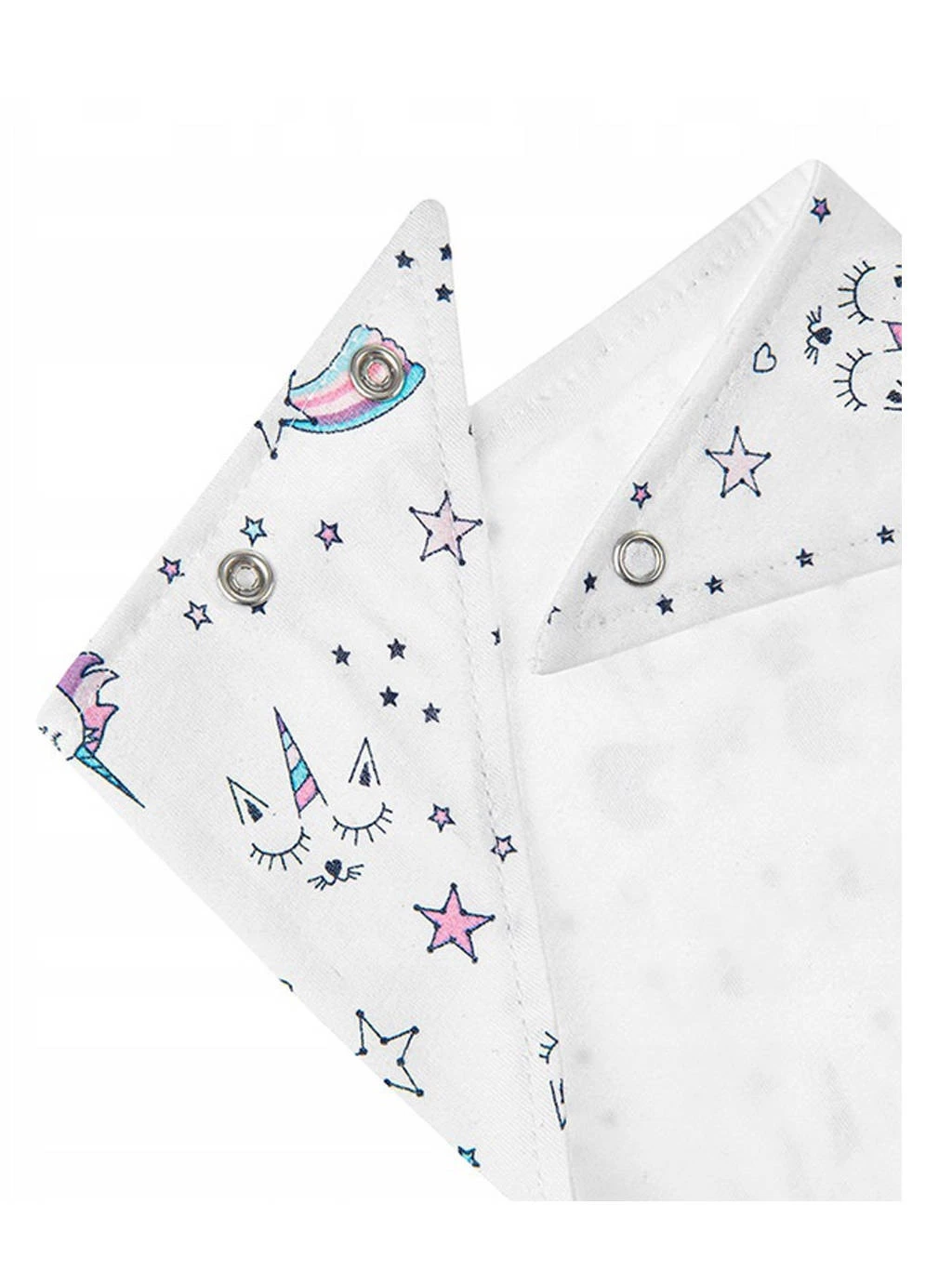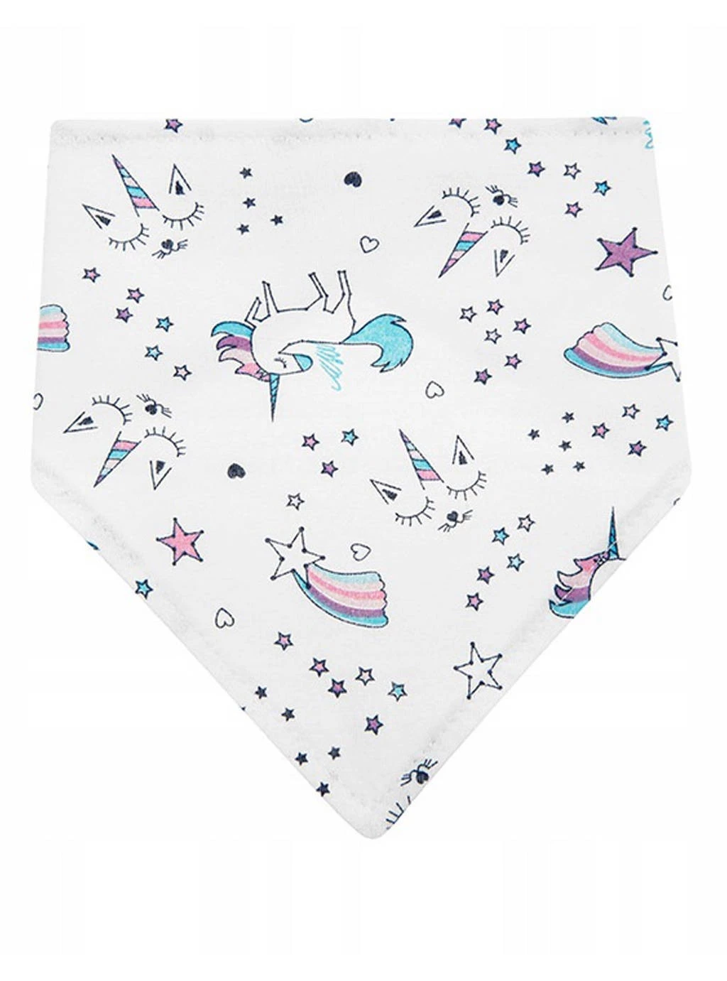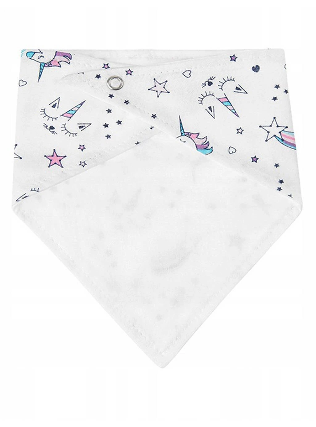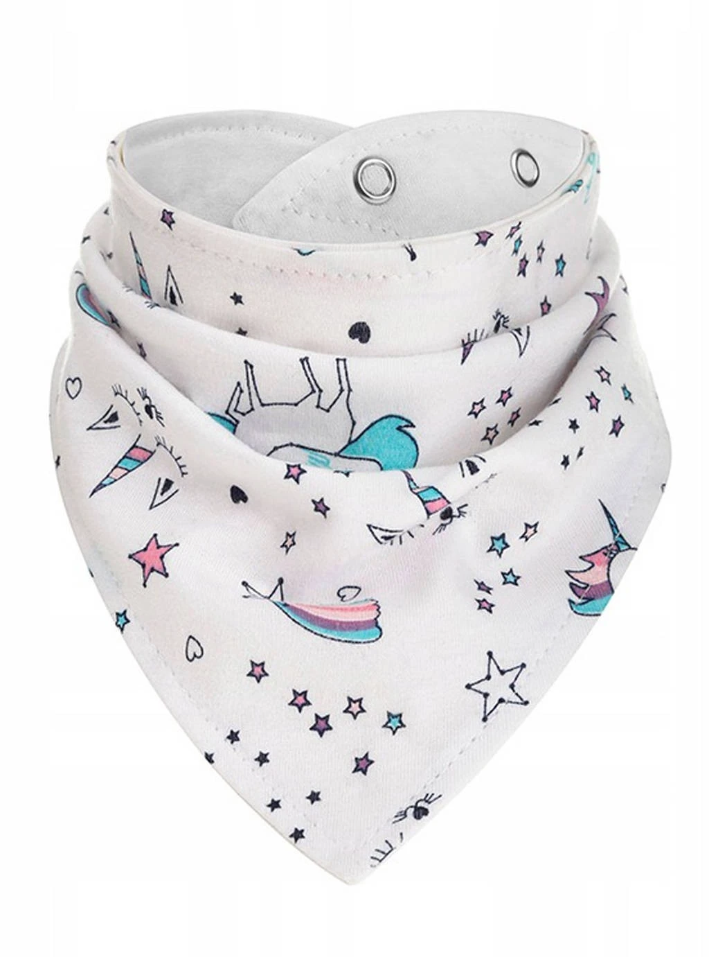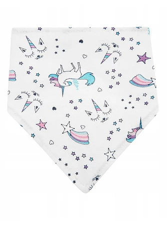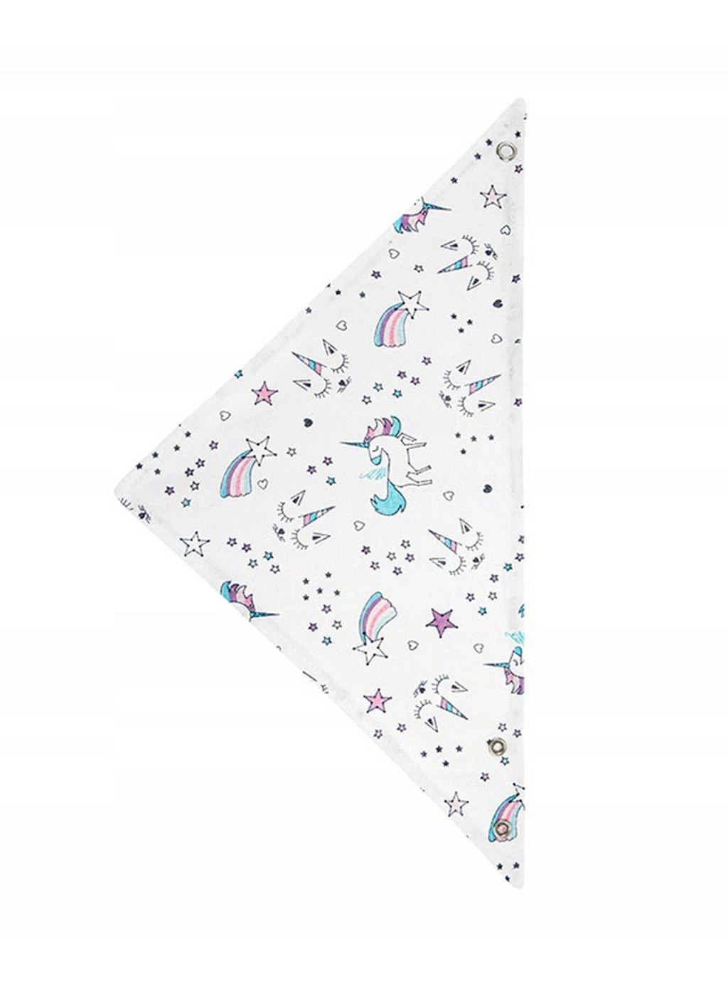 Bandanka/śliniak/apaszka z kolorowymi dziecięcymi nadrukami w postaci jednorożców na białym tle. Komfortowa osłona dla dziecka osłaniając szyję, chroni przed zabrudzeniem element ubioru dziecka w pobliżu buzi a to dlatego że apaszki mogą być używane zarówno jak śliniak.