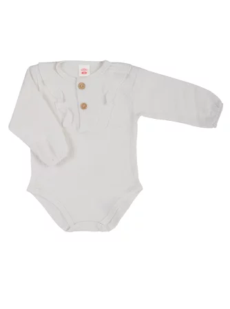 Przedstawiamy Państwu rozpinane body niemowlęce z długim rękawem i ozdobną falbanką. Białe body niemowlęce wykonane z bawełny i antyalergicznego bambusa jest bezpieczne dla delikatnej skóry dziecka skłonnej do alergii. Dla waszej wygody jest zapinane pod szyjką na ozdobne drewniane guziczki a w kroku na bezniklowe napy, co bardzo ułatwia ubieranie i rozbieranie maluszka. Idealnie sprawdza się nawet świeżo upieczonym rodzicom. Body polskiej produkcji wykonane z miłej w dotyku mieszanki bambusa i bawełny, powinno być podstawą każdej wyprawki do szpitala, dlatego warto zaopatrzyć się w parę sztuk ponieważ w pierwszych dniach życia pociecha dość sporo ich zużywa. Wyjątkowo miękkie body muślinowe jest odporne na światło UV i bardzo trwałe, przy odpowiedniej pielęgnacji i praniu w 30st zostanie z wami na długi czas. Urocze body rozpinane na ozdobne guziczki i bezniklowe napy to świetny pomysł na outfit w upalny dzień. Body niemowlęce wykonane z bawełny i odpornego bambusa przepuszcza powietrze dzięki czemu delikatna skóra maluszka nie jest narażona na podrażnienia i alergię.