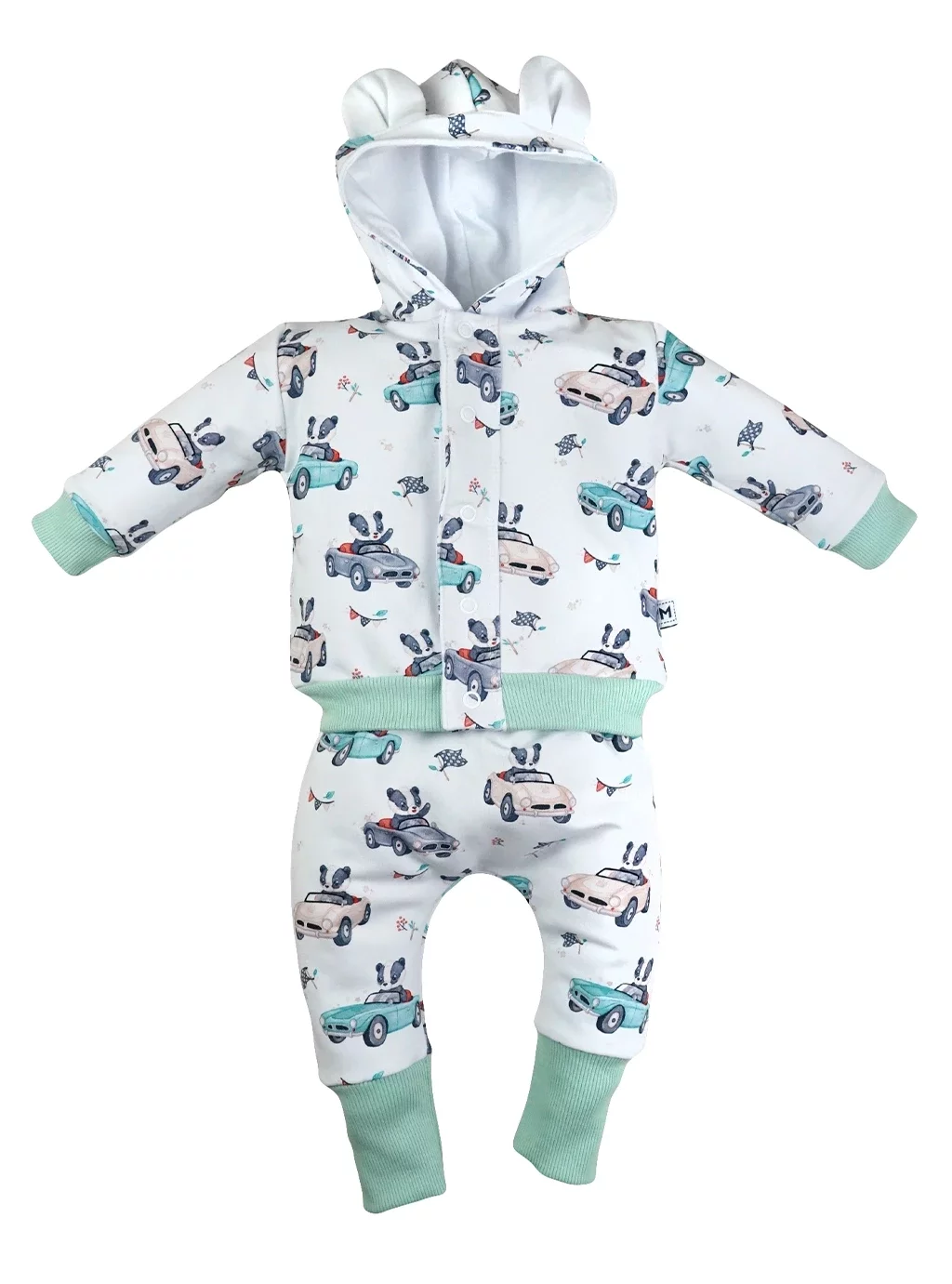 Uroczy sportowy komplet składający się ze spodni z wygodnym pasem oraz z komfortowej bluzy z kapturkiem i długim rękawem zapinanej na bezniklowe napy. Komplet z oddychającej bawełny wykończony bez uciskowym ściągaczem w kolorze pistacjowym, i delikatnymi uszkami na kapturze to hit sprzedażowy od marki Mrofi. Jeżeli nie masz pomysłu w co ubrać swoje maleństwo wybierz wyjątkowy zestaw niemowlęcy w urocze borsuki w autkach, które zapewnią nie tylko fajny wygląd, ale też wysoki komfort, bezpieczeństwo i swobodę ruchu. Bawełniany pas w spodniach nie uciska brzuszka co jest niezwykle ważne w okresie rozwoju. Bluza w śliczne borsuki, będzie idealna na chłodniejsze dni, dla waszej wygody jest zapinana na wygodne bezniklowe napy które nie uczulają maleństwa nawet jeśli ma skórę skłonną do alergii.