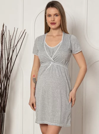 Przewiewna delikatna bawełna ułatwiająca karmienie piersią, to atut jakim może się pochwalić szara koszula w maleńkie gwiazdki na zakładkę. Kobieca koszula nocna do karmienia noworodka to wybór dla kobiet w ciąży który powinna zawierać Twoja wyprawka. Chcemy zadbać o Twój zdrowy sen w czasie ciąży, dlatego zwracamy uwagę na komfort i wygodę jakiej oczekujesz w ciąży, oraz w okresie karmienia piersią. Ubrania ciążowe i koszule ciążowe w naszym sklepie internetowym to przewiewne i wyjątkowo miłe w dotyku produkty jakich teraz potrzebuje przyszła i młoda mama żeby usprawnić nocne karmienia noworodka. Zadbaj o noworodka, wybierz koszule, bieliznę nocną, która dopasuje się do rosnącego brzuszka i zmieniającego ciała.
