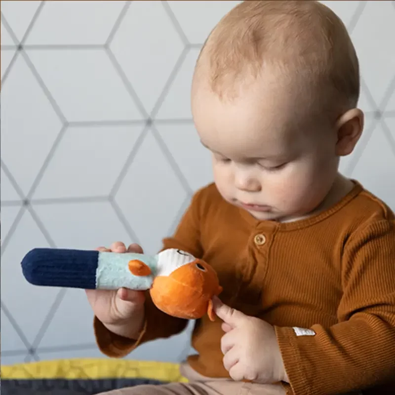 - Interaktywny - Piszczek z grzechotką to zabawka dźwiękowa, która wymaga od dziecka zaangażowania i aktywności. Kiedy maluch ją ściśnie, usłyszy przyjemny dźwięk – tak działa schowana wewnątrz piszczałka. To świetny trening i zachęta do zabawy!