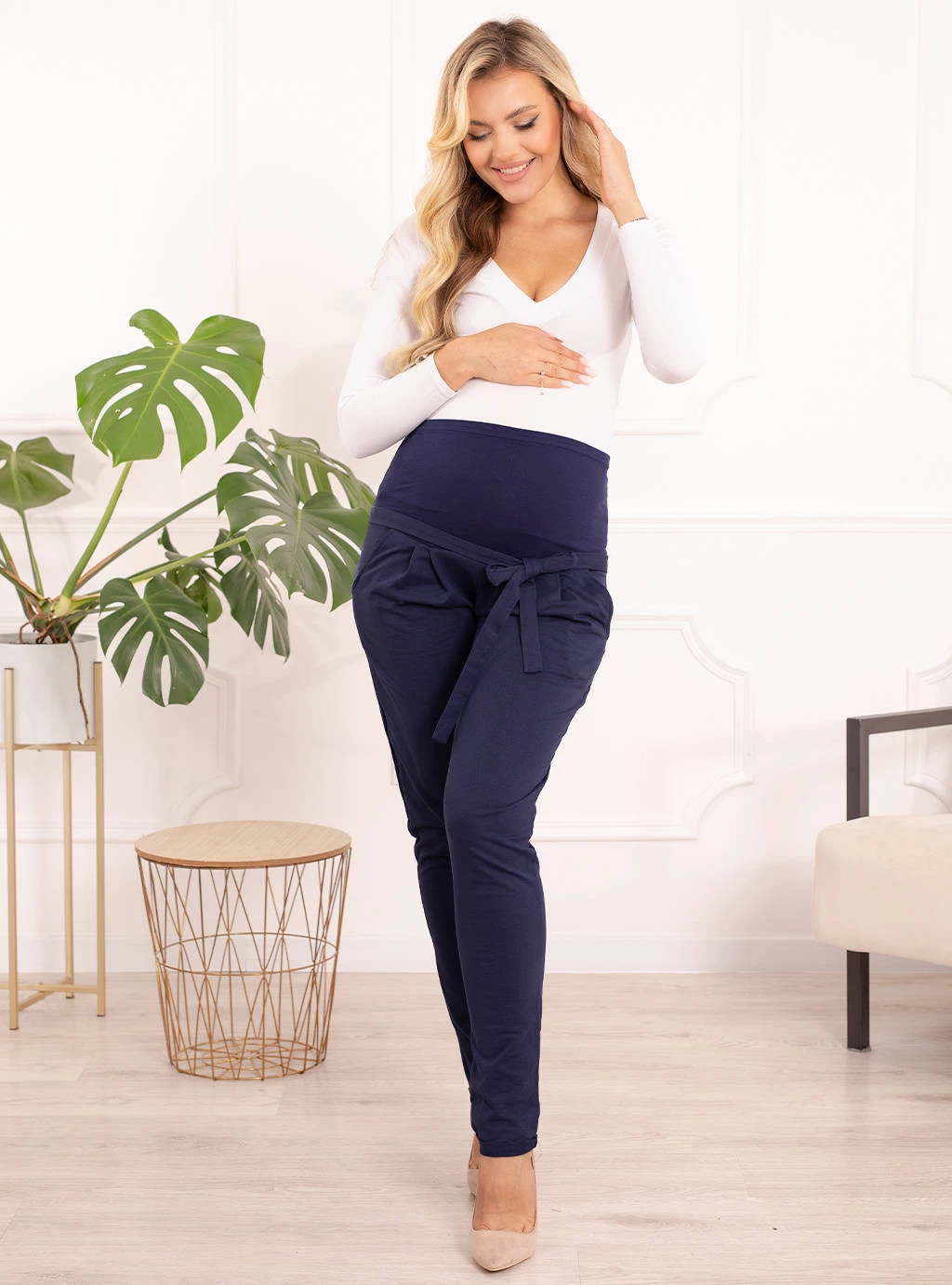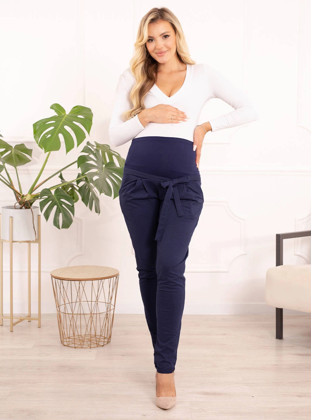 Spodnie dopasowują się do ciała, nie obciskając go. Elastyczny materiał sprawia, że ubranie nie krępuje ruchów oraz jest bardzo wygodne. Ponadto świetnie dopasowuje się do ciała, podkreślając figurę. Materiał, z którego wykonano ciążowe spodnie z kokardką, jest bardzo miękki i delikatny w dotyku.