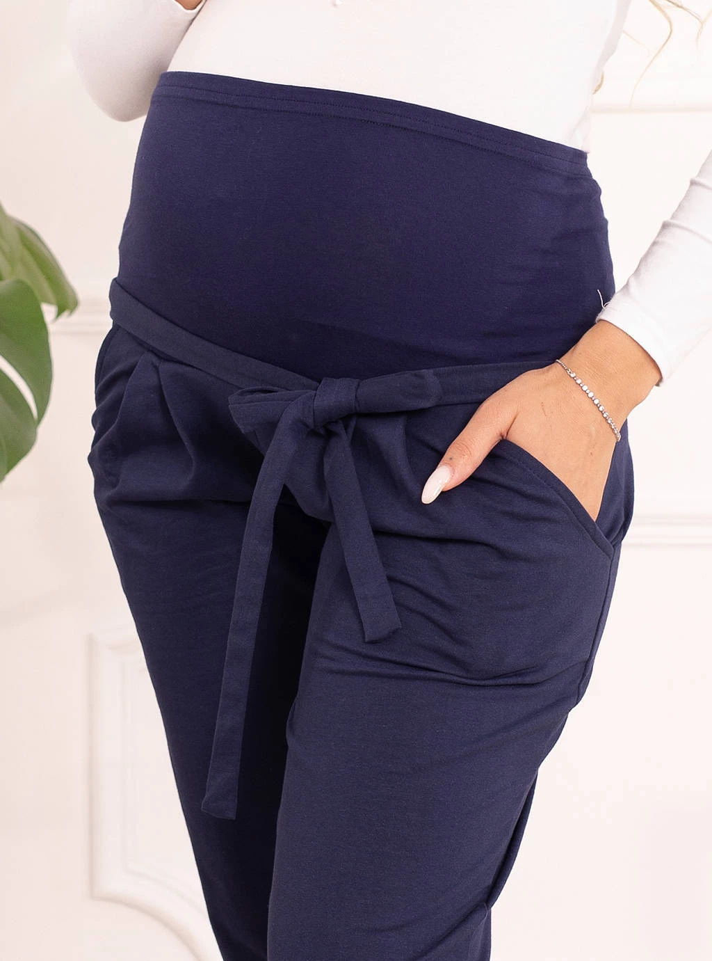 Piękne i wygodne spodnie dresowe damskie ciążowe. Zaprojektowane i uszyte tak, by gwarantowały maksymalną wygodę i komfort noszenia podczas wyjątkowego czasu ciąży i połogu. Dopasowują się do brzucha, nie opinając i nie uciskając ciała. Spodnie ciążowe dresowe posiadają zakładki na wysokości pasa wraz kieszeniami z przodu oraz dodatkowy pasek, który wiązany w formie kokardki nadaje im elegancki styl. Ich najważniejszy atut to bezuciskowy pas wszyty w talii, który idealnie dopasowuje się do brzuszka, podkreślając figurę.