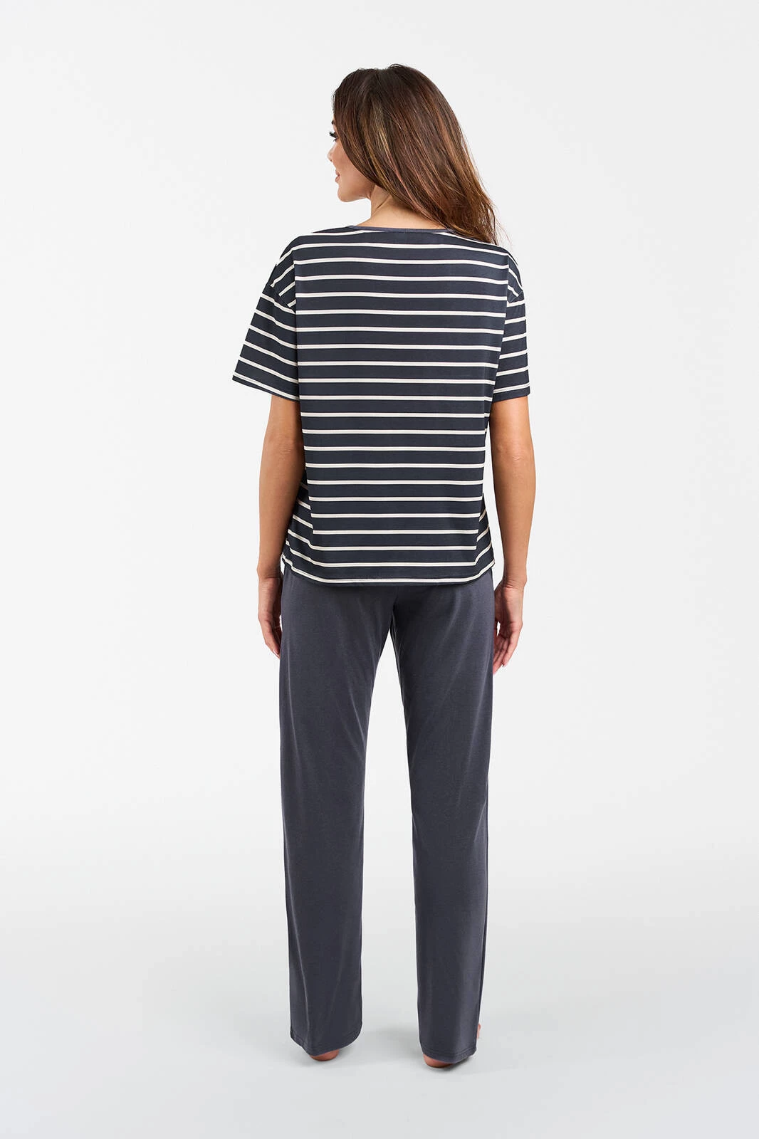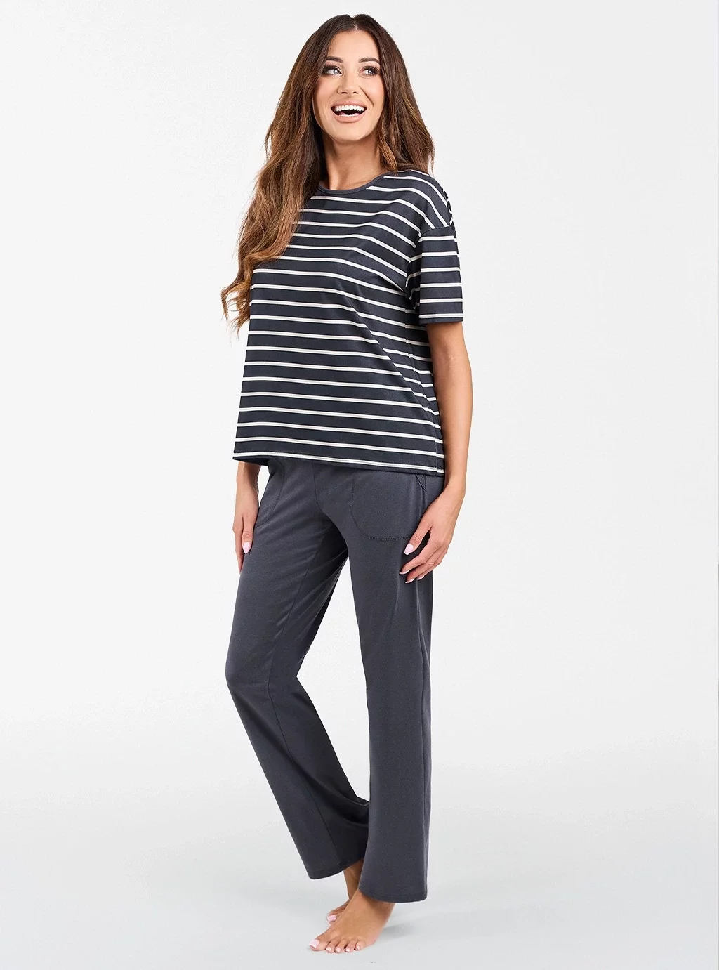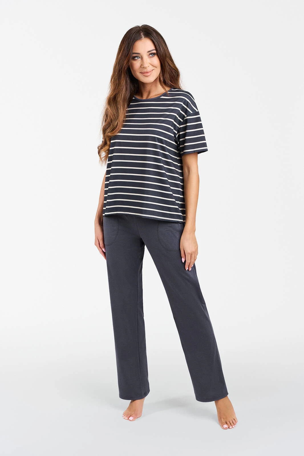 Piżama damska Betty to klasyczna bluzka z krótkim rękawem w kolorze grafitu w białe paski oraz długie spodnie w tym samym kolorze. Ten komplet to stylowa i komfortowa propozycja na noc dla wymagających kobiet.