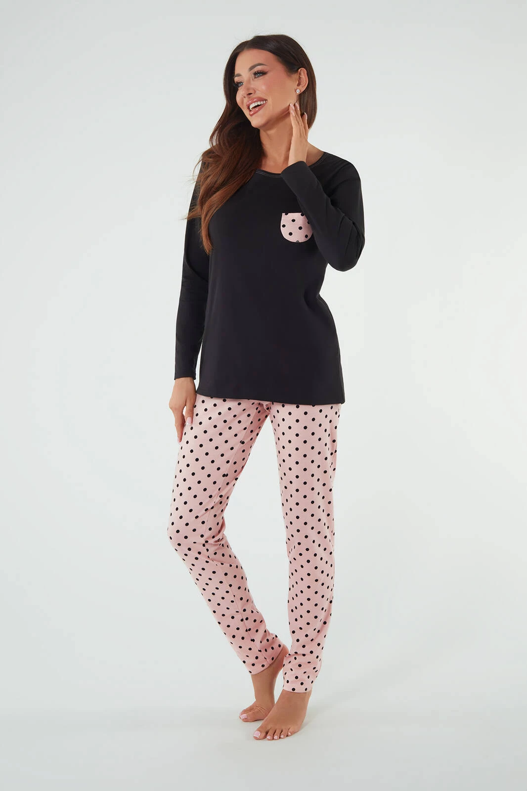 Piżama damska Buscato to czarna bluzka z ozdobną kieszonką i długim rękawem oraz długimi spodniami w kolorze różowym w czarne kropki. Ten komplet to elegancka i komfortowa propozycja na noc dla wymagających kobiet.